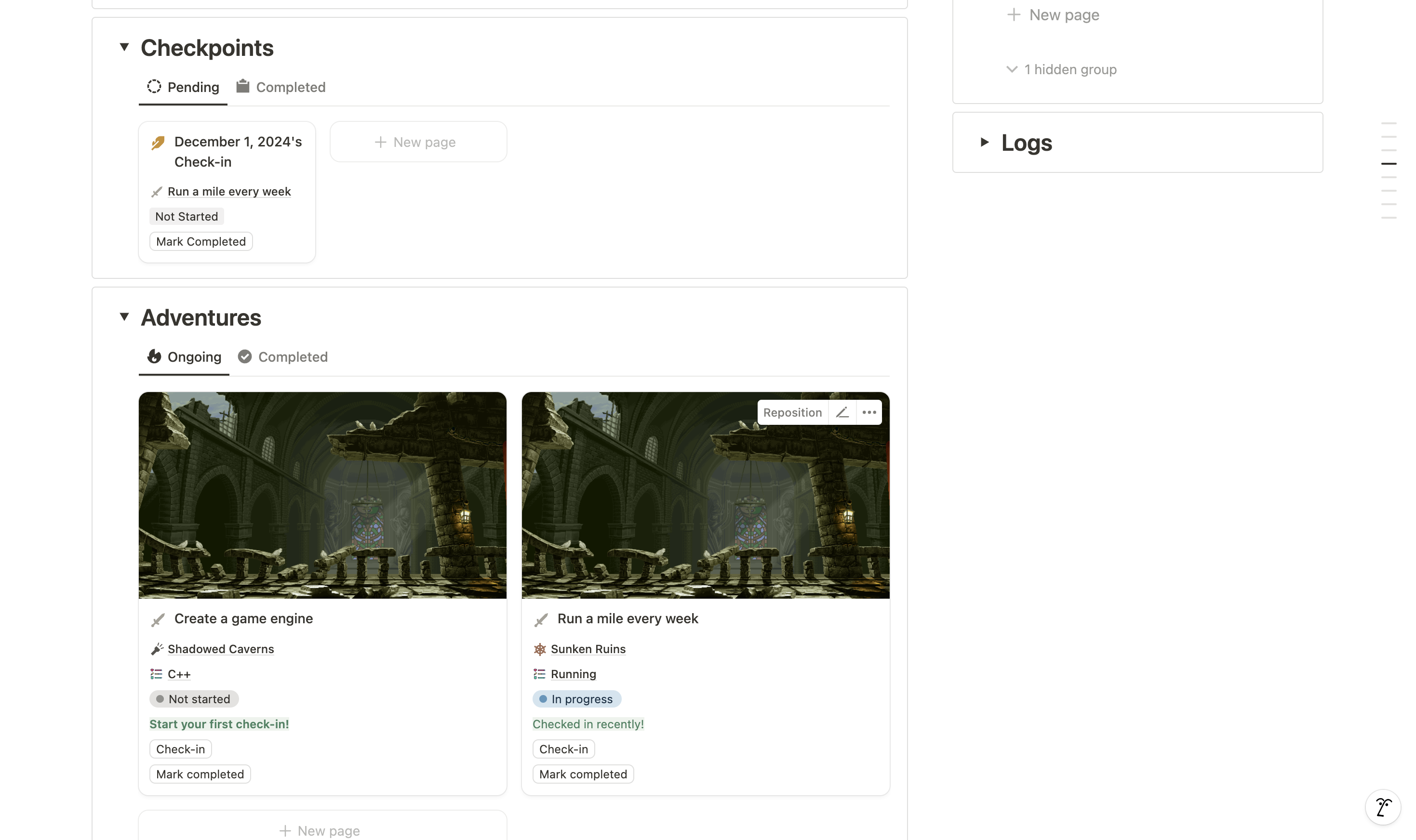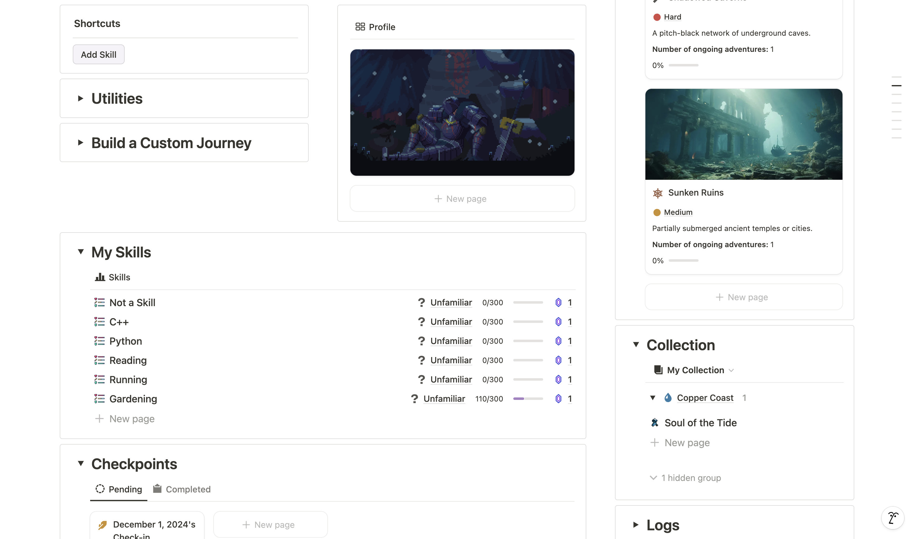 Embark on a thrilling quest to level up your skills with this dynamic goal tracker template! Transform your personal goals into epic adventures, each mapped to unique terrains like forests, mountains, and dungeons. Every adventure represents a goal you're working towards, and as you progress, you’ll gain experience points (XP) for your chosen skill—whether it’s creativity, productivity, fitness, or something else entirely. Track your journey by creating check-ins for each adventure, where you can write personal reflections, document your progress, and watch your XP grow as you complete milestones. With every goal you achieve, you’ll collect loot and unlock new achievements, making the process of self-improvement feel like an exciting game. With each goal, you’re not just ticking off tasks—you’re building a personal story of growth and achievement. Each check-in is a new chapter, each milestone a victory that moves you closer to mastery. Whether you’re leveling up in real life or just looking for a more exciting way to crush your goals, this template turns personal development into an epic adventure. Ready to start your quest?